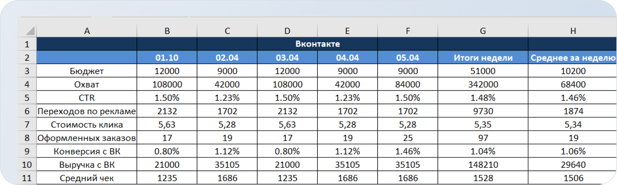 Маркетинговый отчёт имеет смысл вести, если вы запускаете рекламу. В таблицу Excel нужно внести данные для анализа эффективности рекламного канала: потраченный бюджет, количество заказов, их стоимость, средний чек.