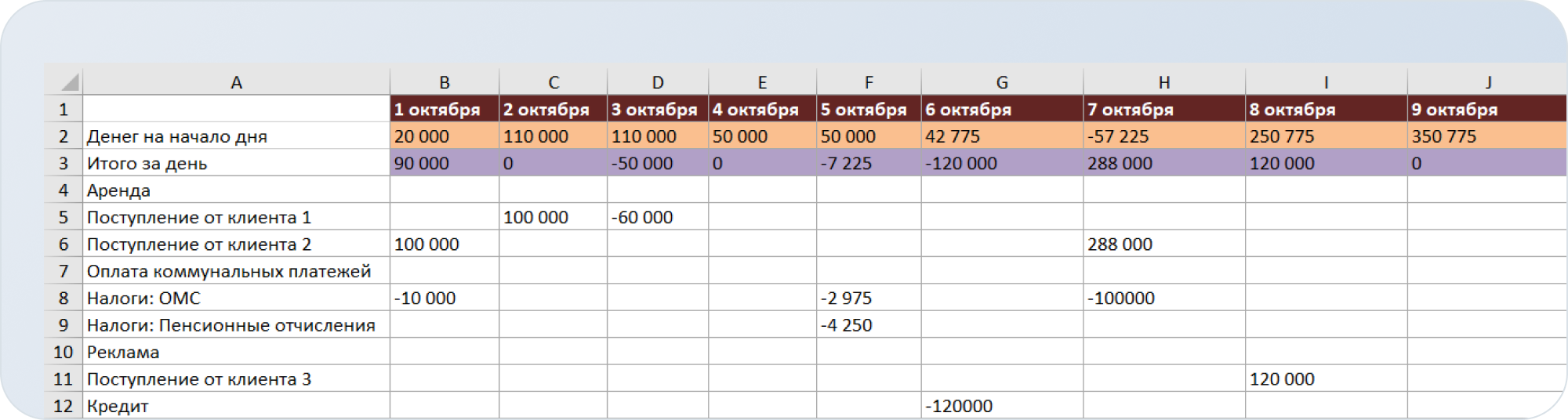 Можно учитывать и будущие расходы: налоги, аренду и так далее. Так вы можете отслеживать и кассовый разрыв, например, за аренду вы уже заплатили, а поступления денег ещё не было.