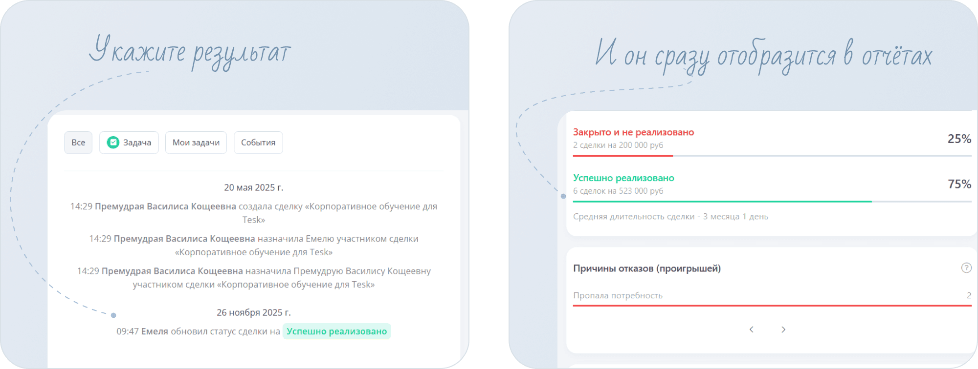 Закрыто и не реализованоилиУспешно реализовано. При указании статусаЗакрыто и не реализованомы рекомендуем указывать причину, она отобразиться в отчётах и поможет принимать полезные для бизнеса решения.