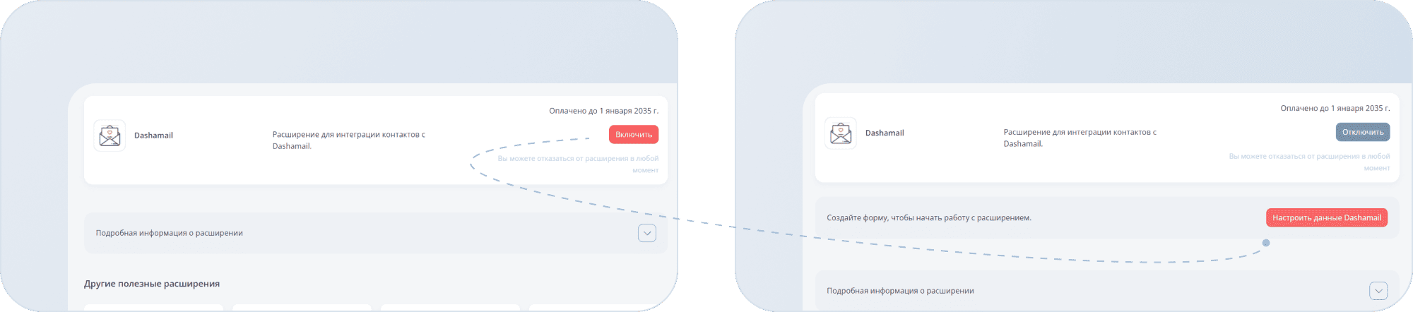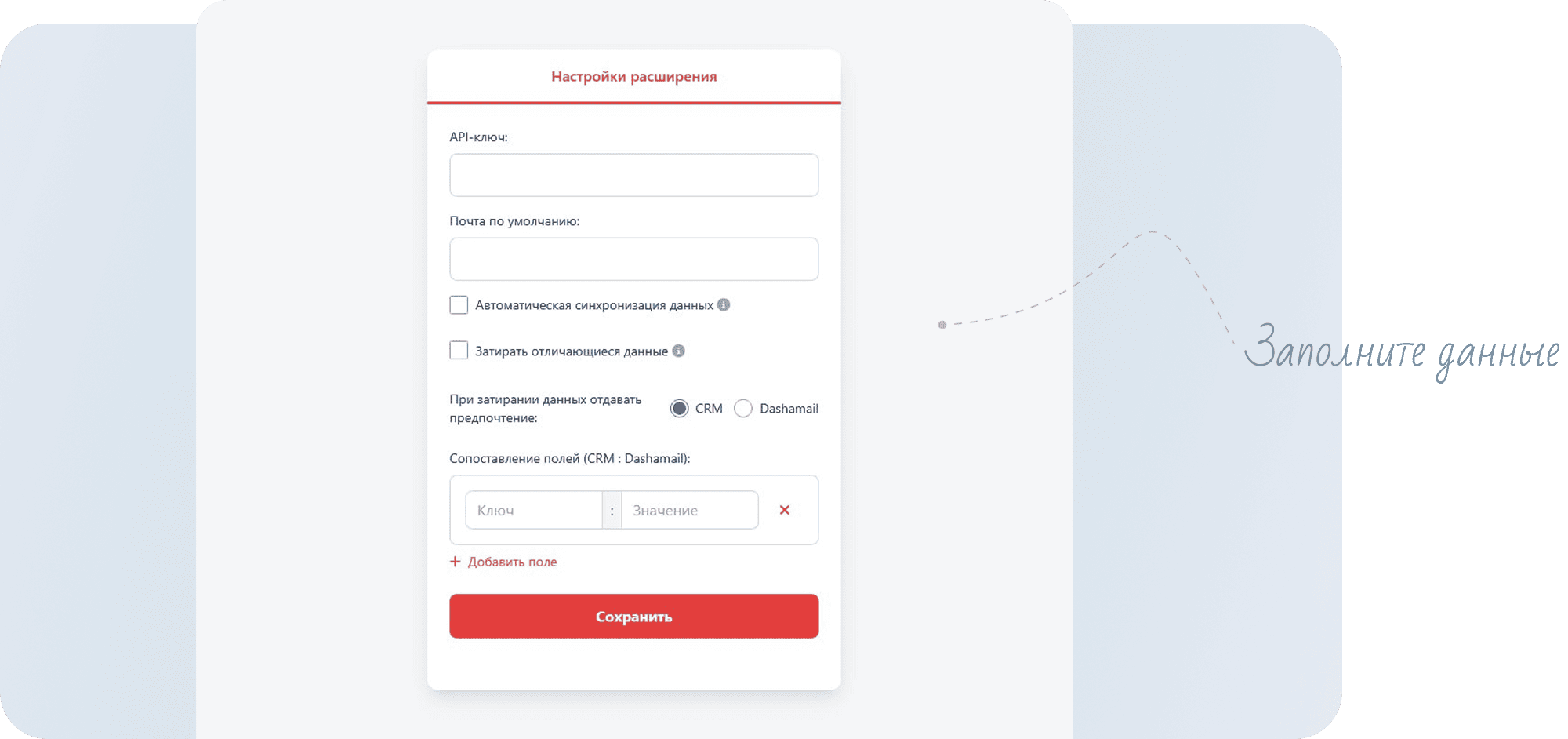- Настройте расширение: укажите API-ключ (его можно найти в самом сервисе), адрес почты, с которого будет осуществляться взаимодействие с клиентами, а также ключ в виде названия поля в CRM и соответствующее ему поле в Dashamail. Это сопоставление понадобится для корректного переноса и обновления данных.