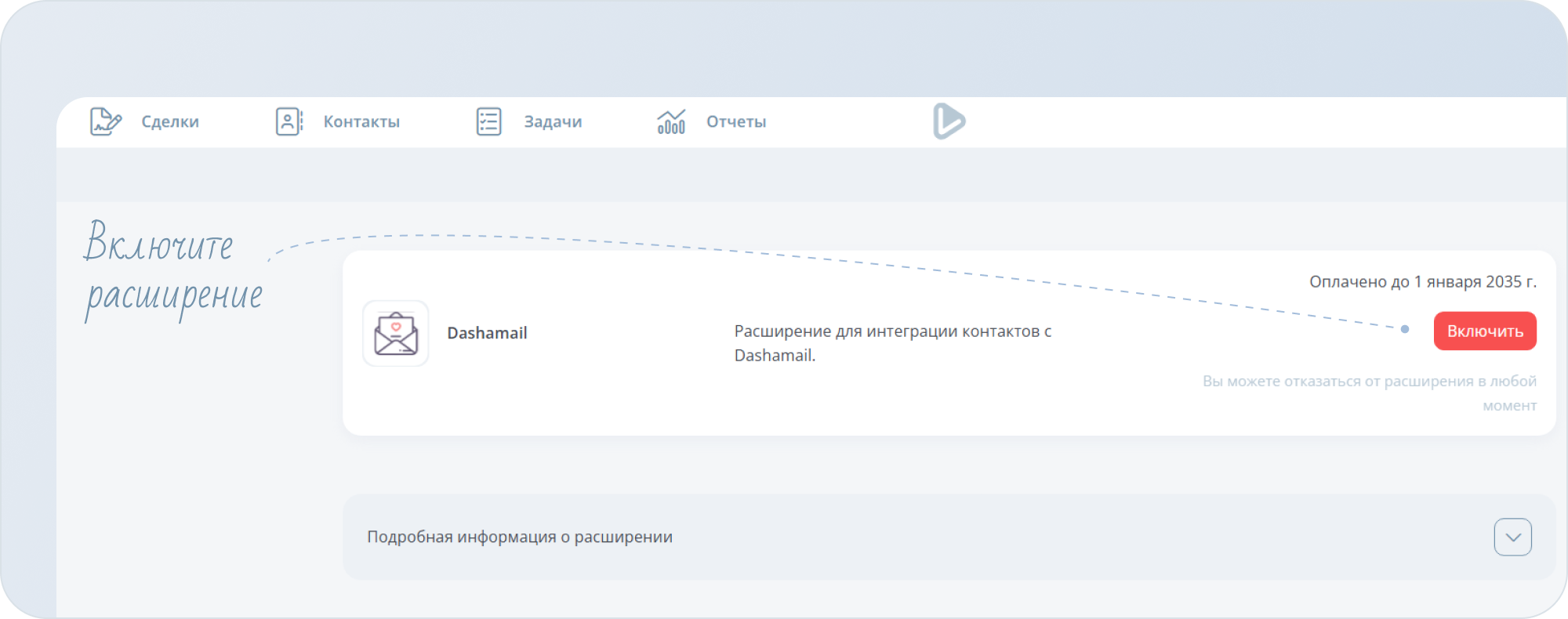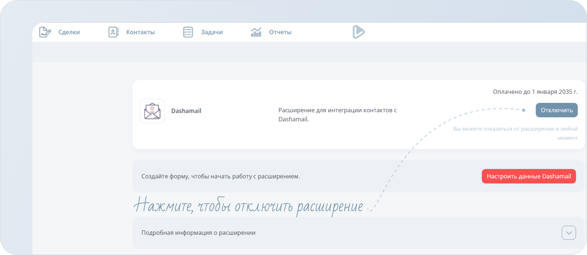 - Автоматическая синхронизация данных — один раз в день программа проверяет, какие новые данные появились в CRM и Dashamail, и затем их синхронизирует.