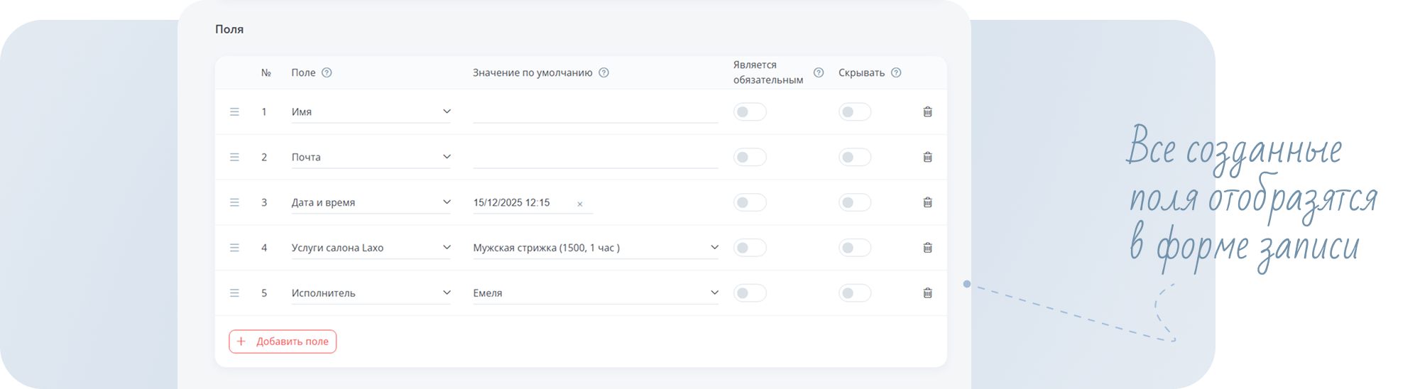 - Теперь создайте поля для формы записи, которые будет заполнять клиент. В нашем примере использованы поля: