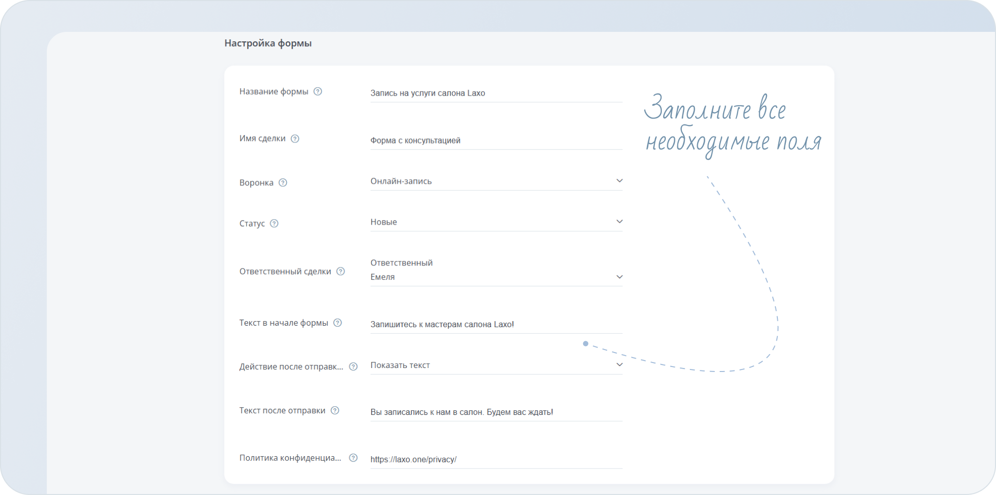 - Заполните поля настройки формы. Все поля, кроме