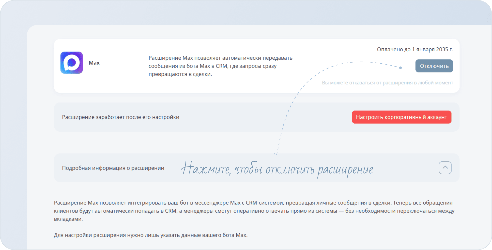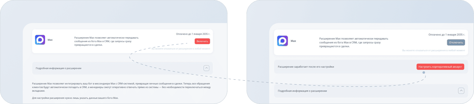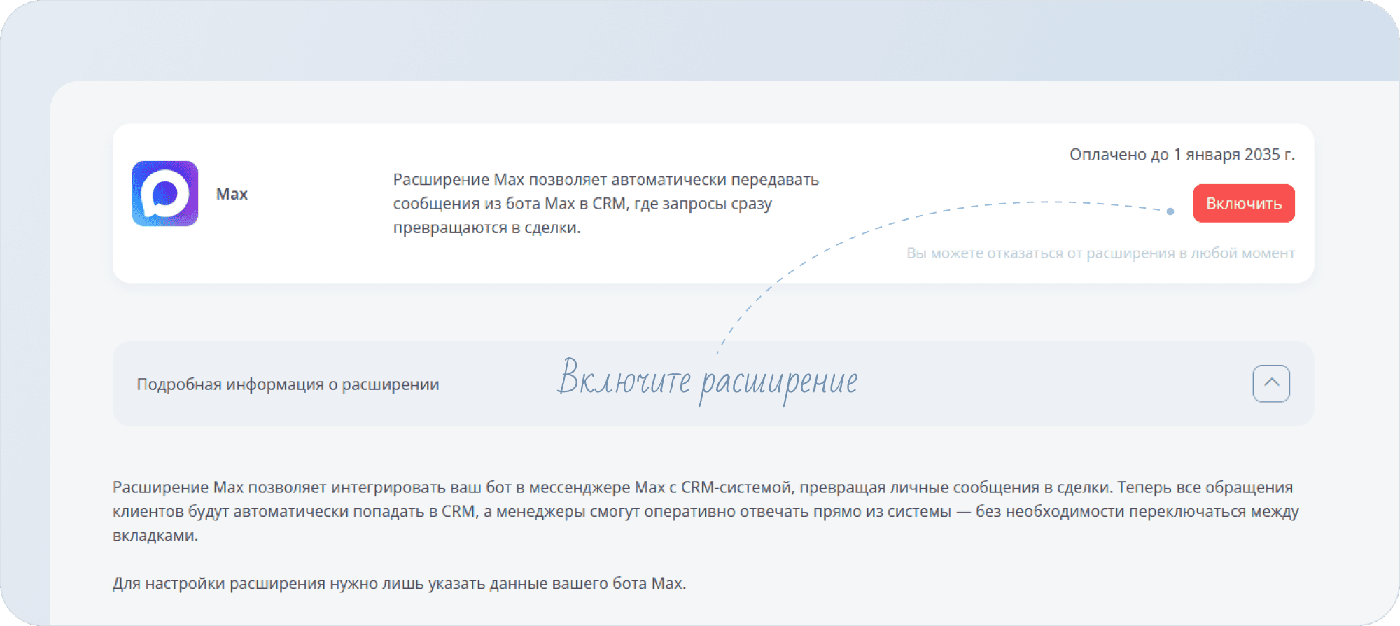 Перед подключением расширения убедитесь, что ваш чат-бот уже создан в Max. Инструкцию по созданию организации в мессенджере можно найти здесь.