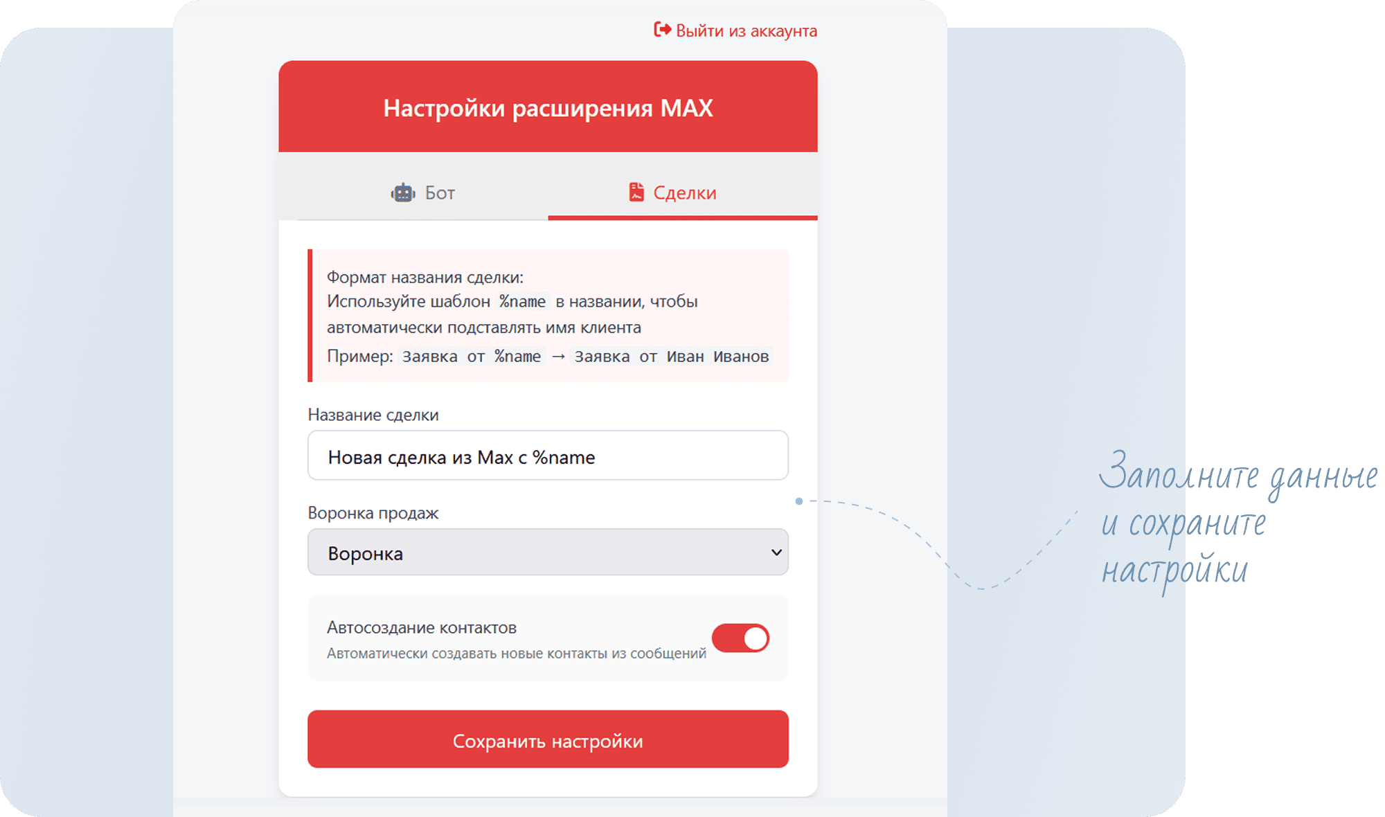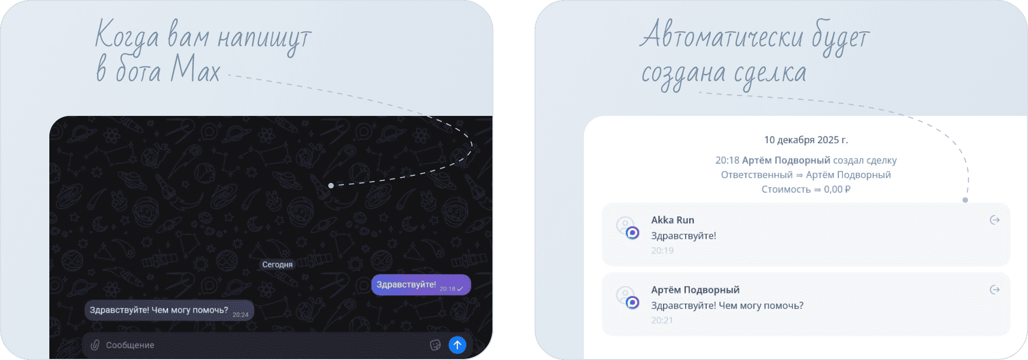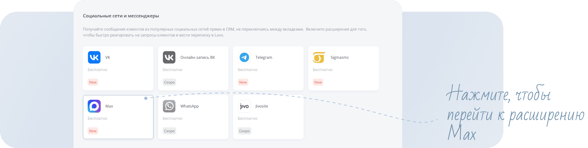 С расширением Max вы сможете упростить общение с клиентами: всё сообщения из вашего бота сразу попадают в CRM и превращаются в сделки. Больше не нужно переключаться между вкладками, отвечать можно прямо из laxo. Подключите вашего бота, чтобы коммуникация стала еще быстрее и удобнее.
