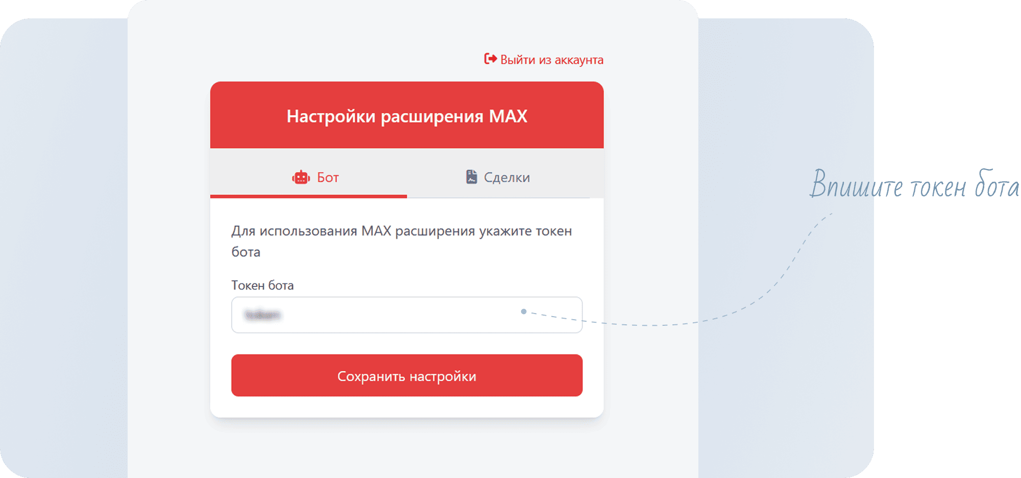 - Впишите токен чат-бота. Эти данные можно найти в настройках бота на платформе