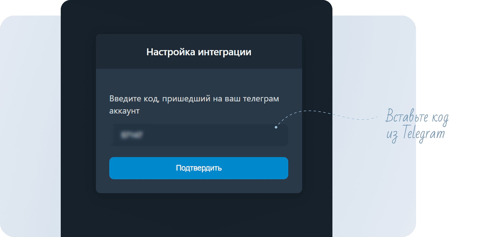 - Код будет отправлен в Telegram, введите его.