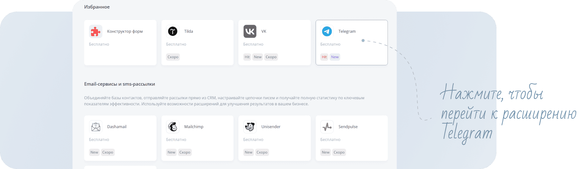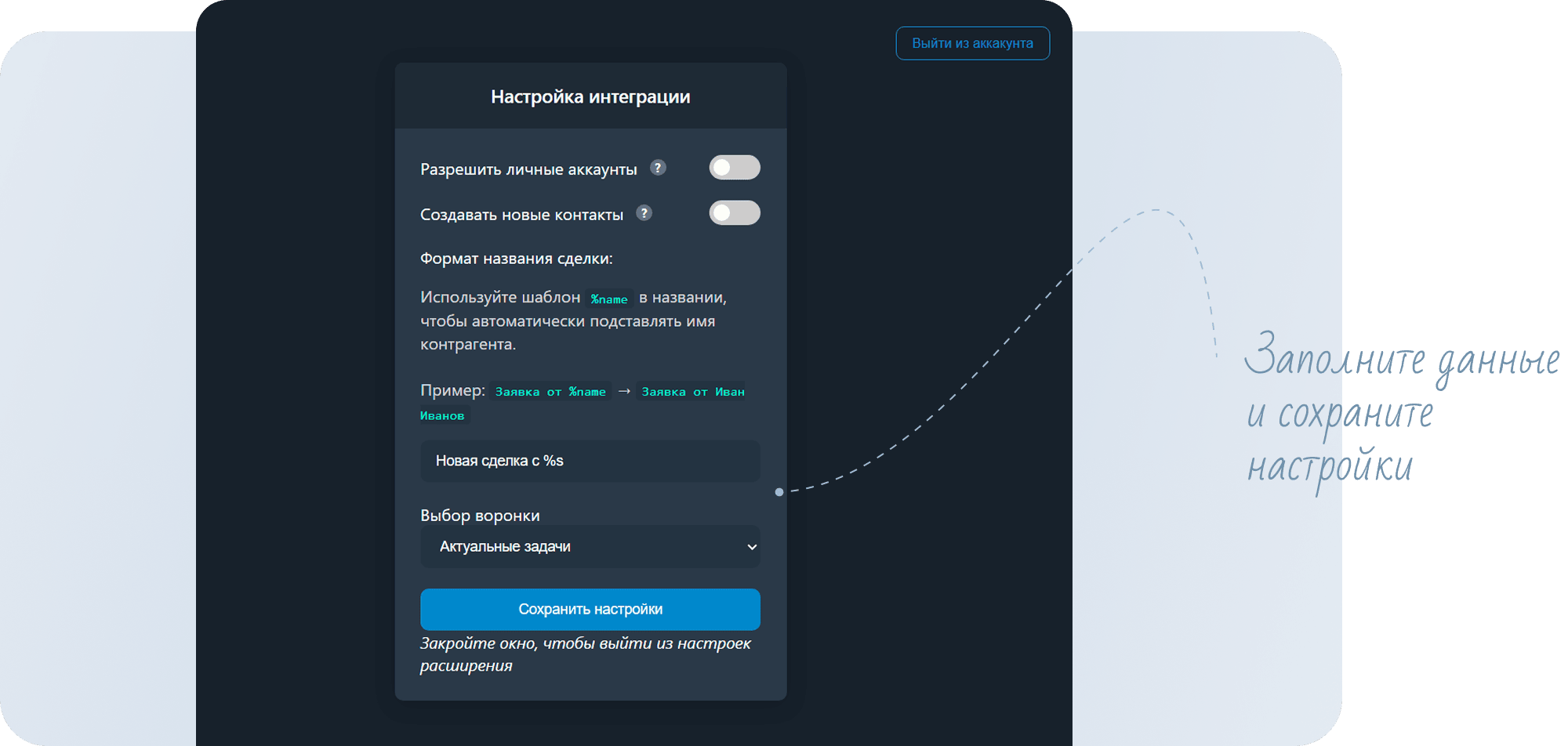- Настройте расширение: укажите, как будут называться сделки, полученные через Telegram, а также выберите для них воронку.