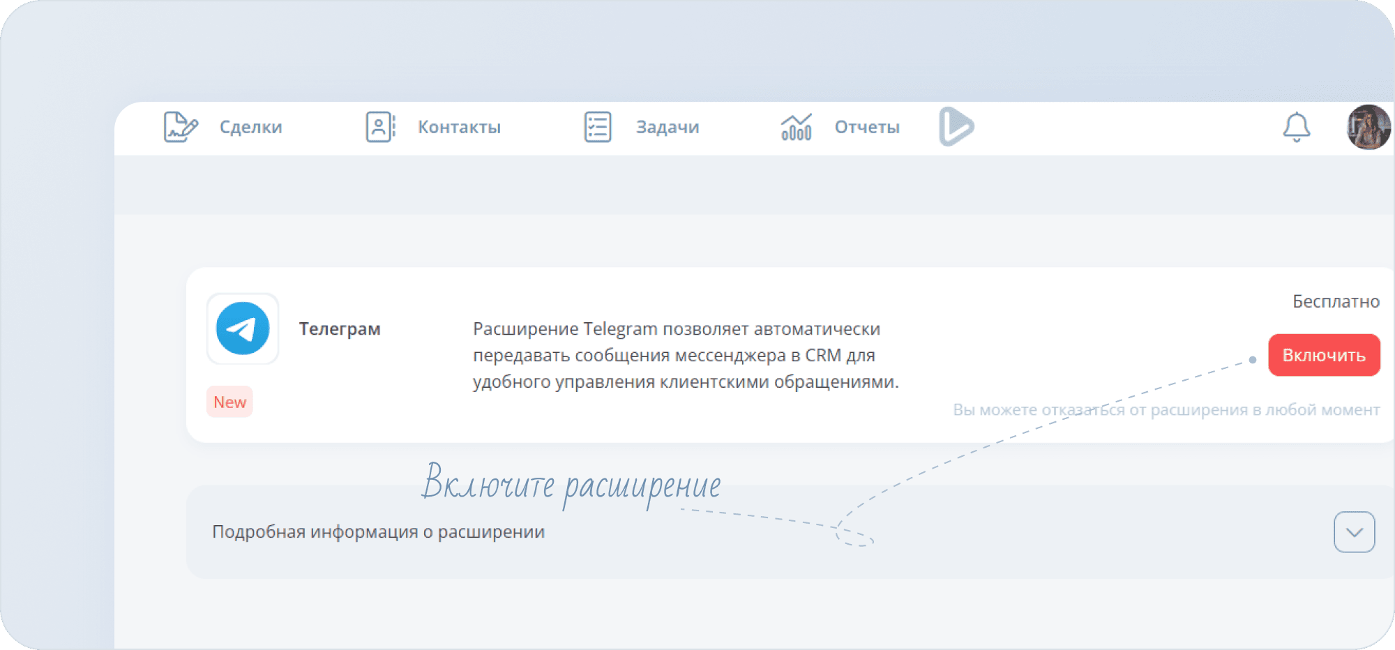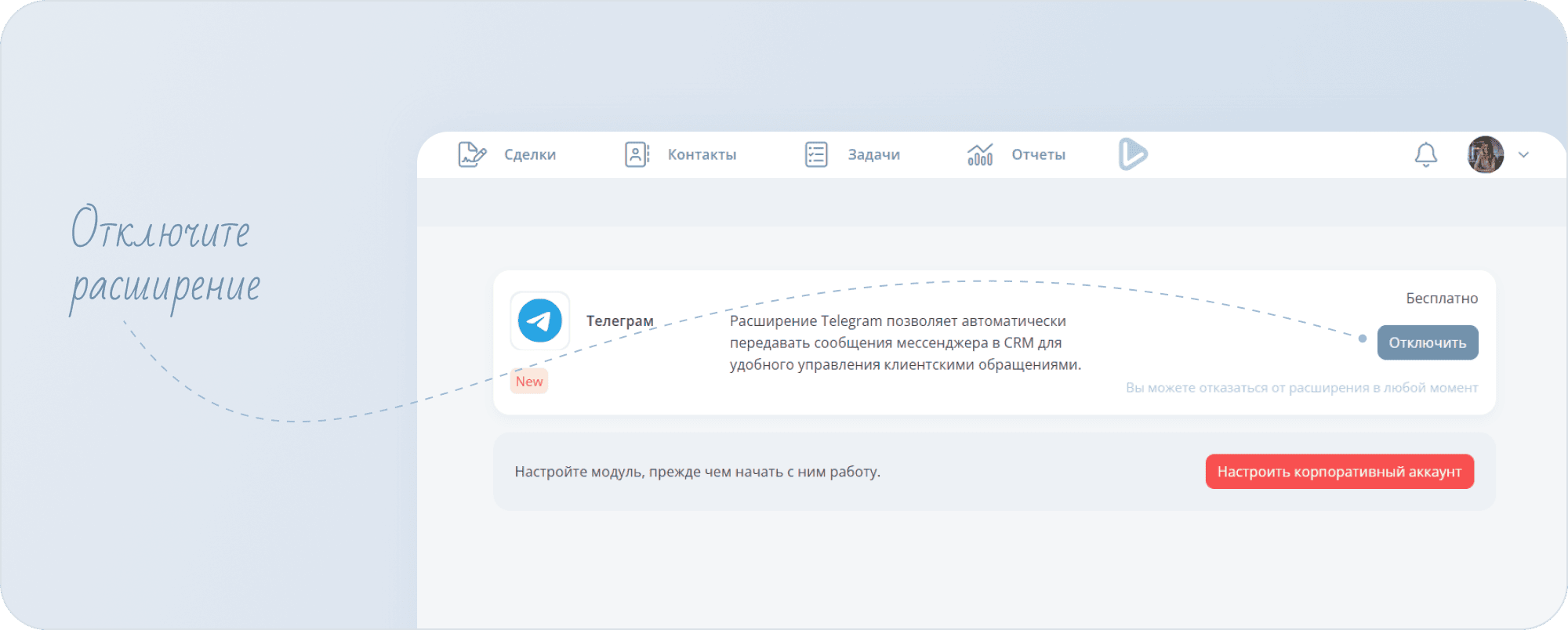 - Чтобы подключить расширение Telegram, нажмите на стрелку рядом с иконкой вашего профиля и нажмите