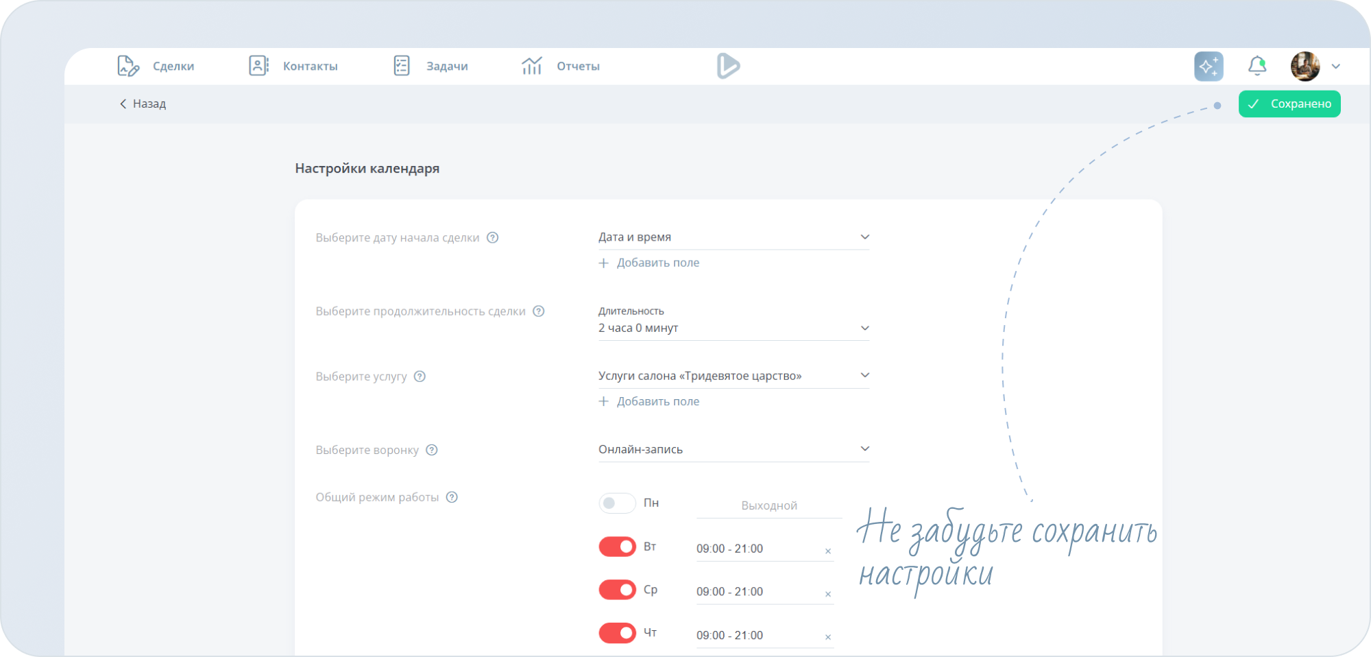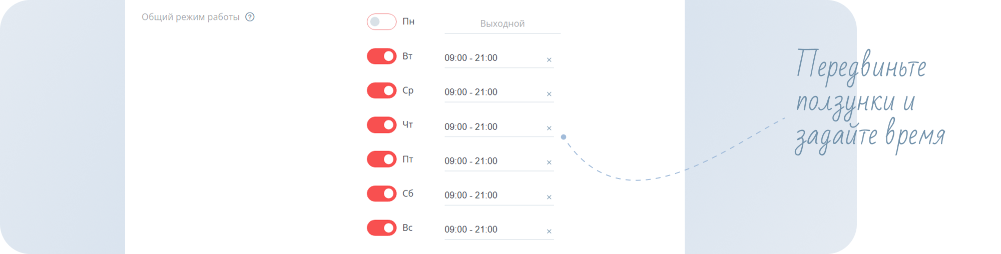 - Настройте общий режим работы компании. Если у вашего салона, допустим, выходной в понедельник, то отключите этот день.