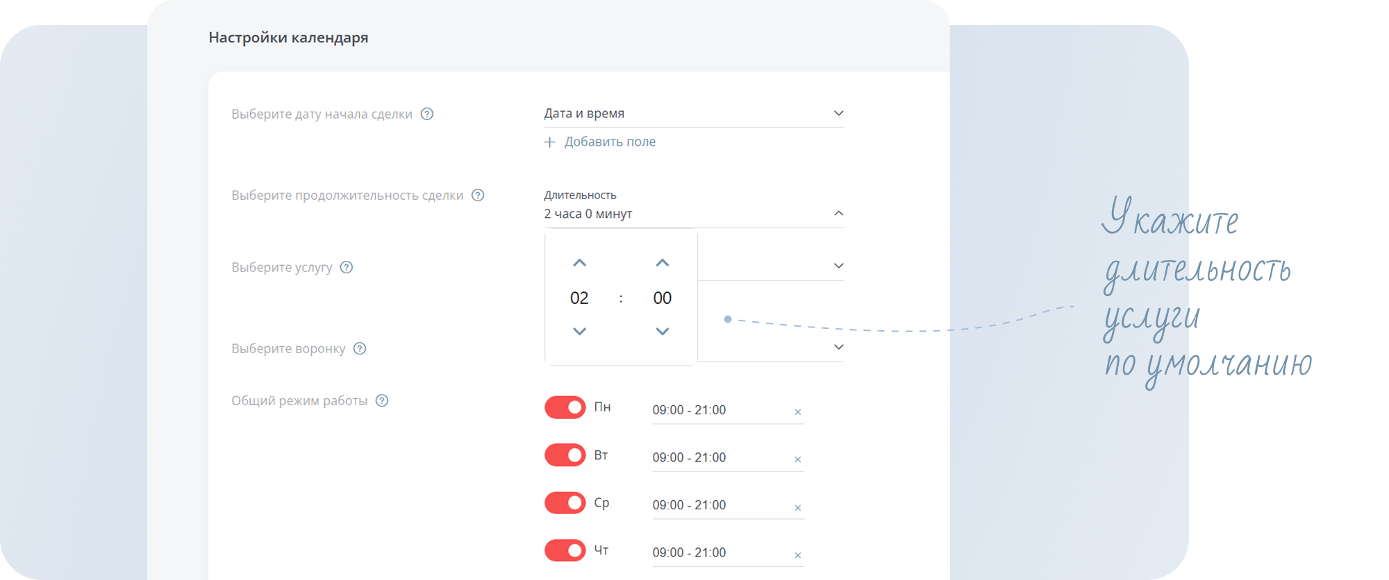 Если клиент при заполнении формы не выбрал конкретную услугу, длительность сделки будет рассчитываться по значению, указанному в этой строке.