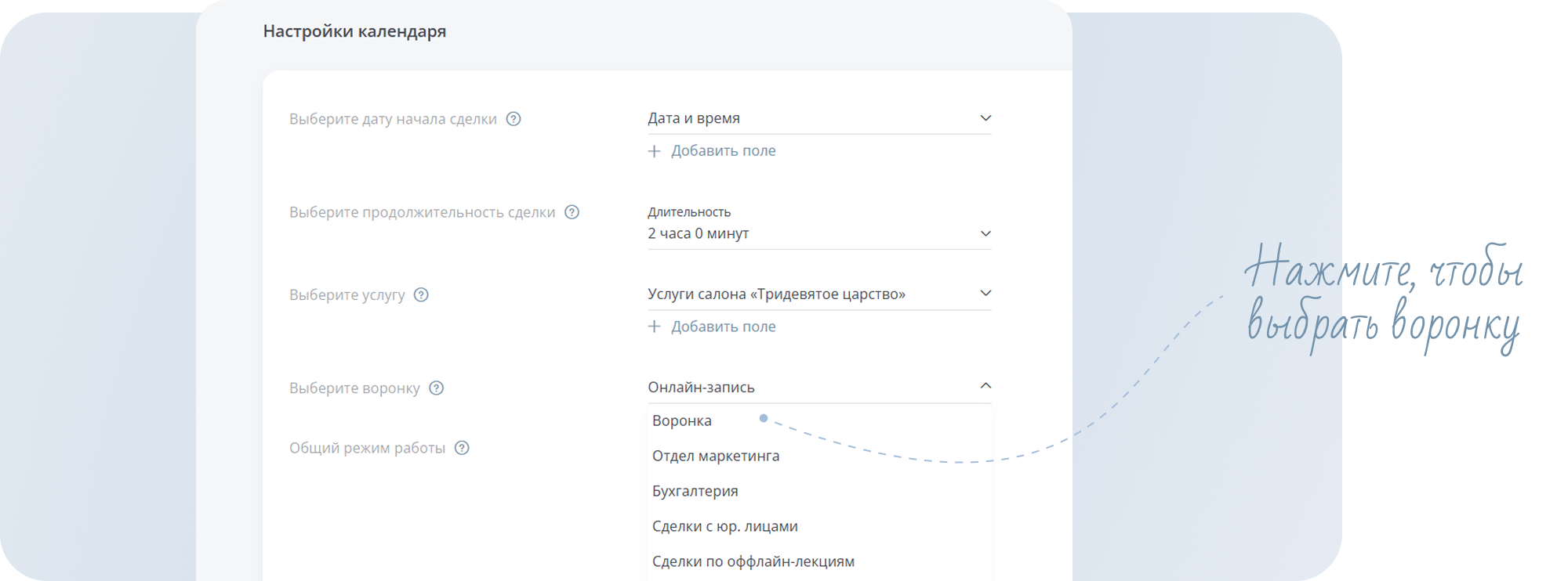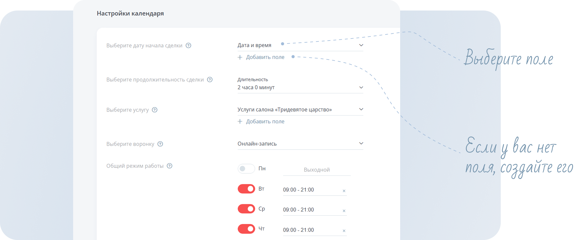 Дата, в котором клиент будет выбирать дату и время услуги. Если вы ещё не создавали такое поле, нажмите кнопкуДобавить поле.