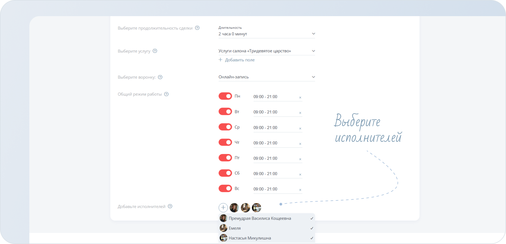 - Теперь укажите исполнителей услуг. Нажмите