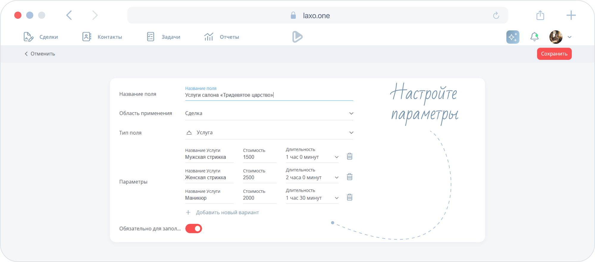 Добавить полев пункте «Выберите услугу». Назовите его условно, например, «Все услуги» и выберите область примененияСделки. Укажите тип поляУслуга, тогда вы сможете настроить весь список.