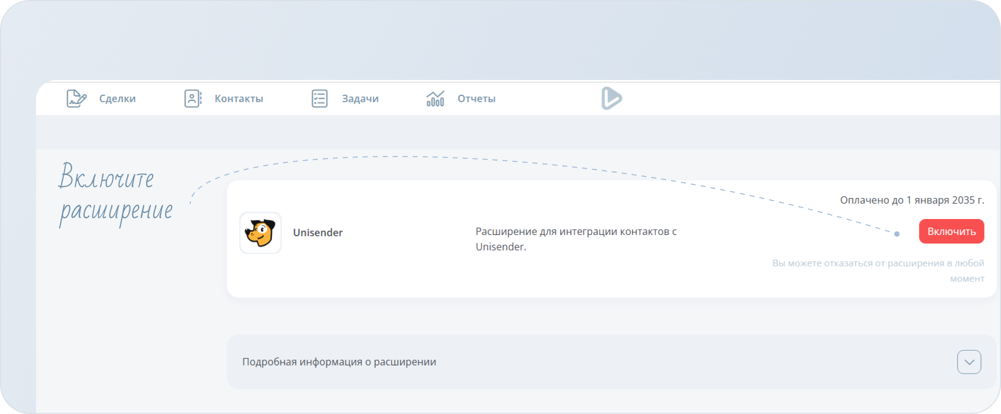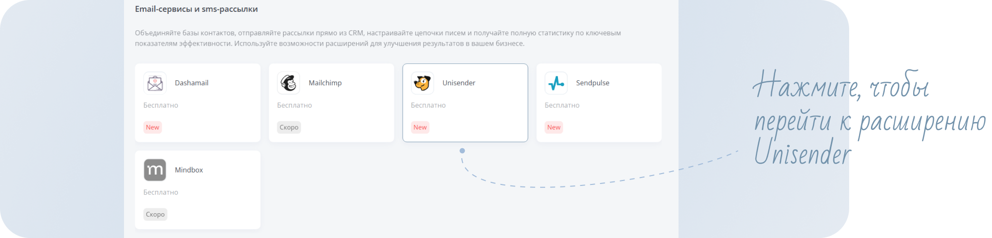 Расширение с Unisender помогает автоматизировать отправку email: вы сможете обращаться к клиентам по имени, выбирать удобное для них время и выстраивать цепочки сообщений с разными сценариями. Это упрощает коммуникацию и позволяет эффективнее удерживать клиентов. Подключите Unisender, чтобы сделать ваши рассылки более точными и удобными.