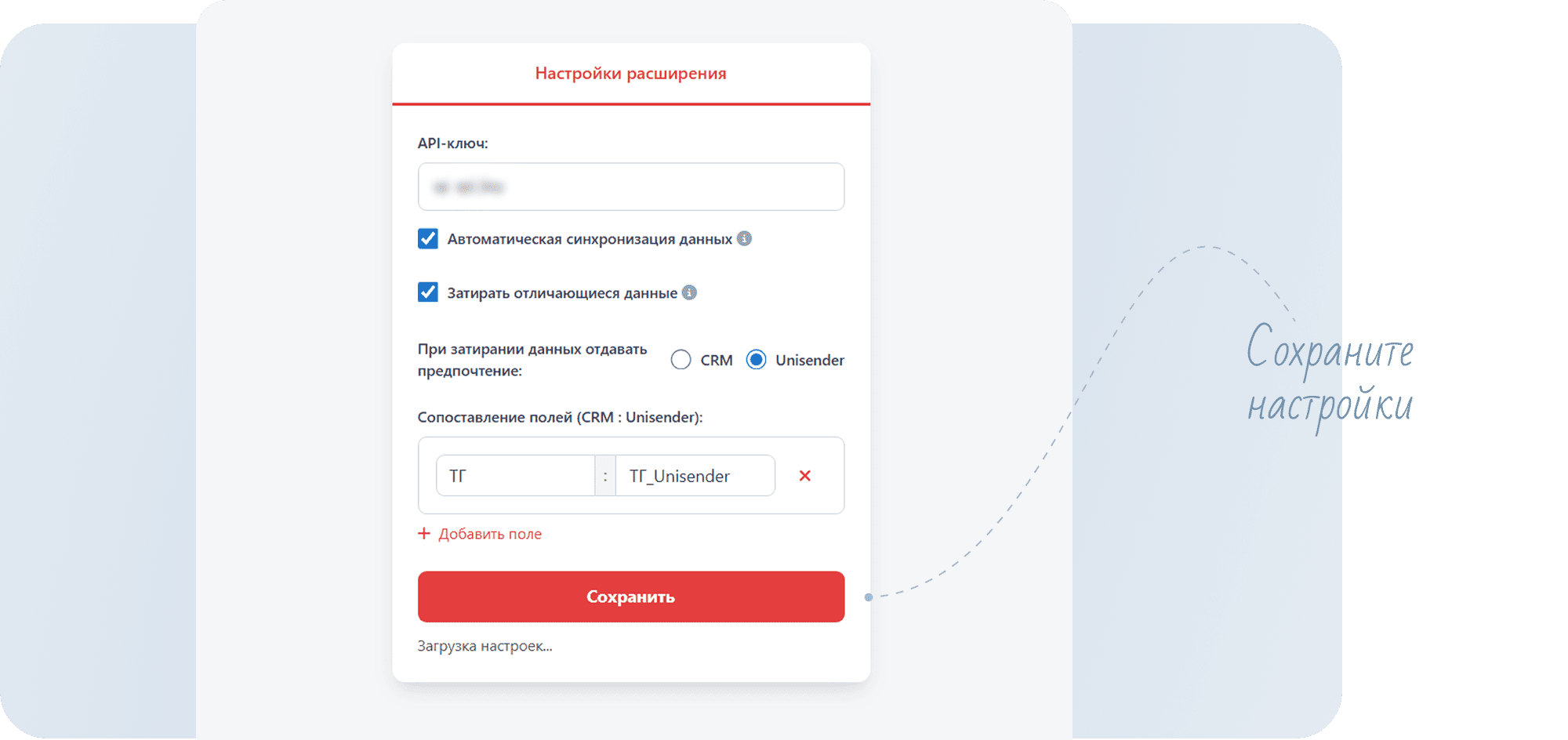 - Настройте расширение: укажите API-ключ (его можно найти в самом сервисе), а также ключ в виде названия поля в CRM и соответствующее ему поле в Unisender. Это сопоставление понадобится для корректного переноса и обновления данных, например при их синхронизации между разными CRM-системами.
