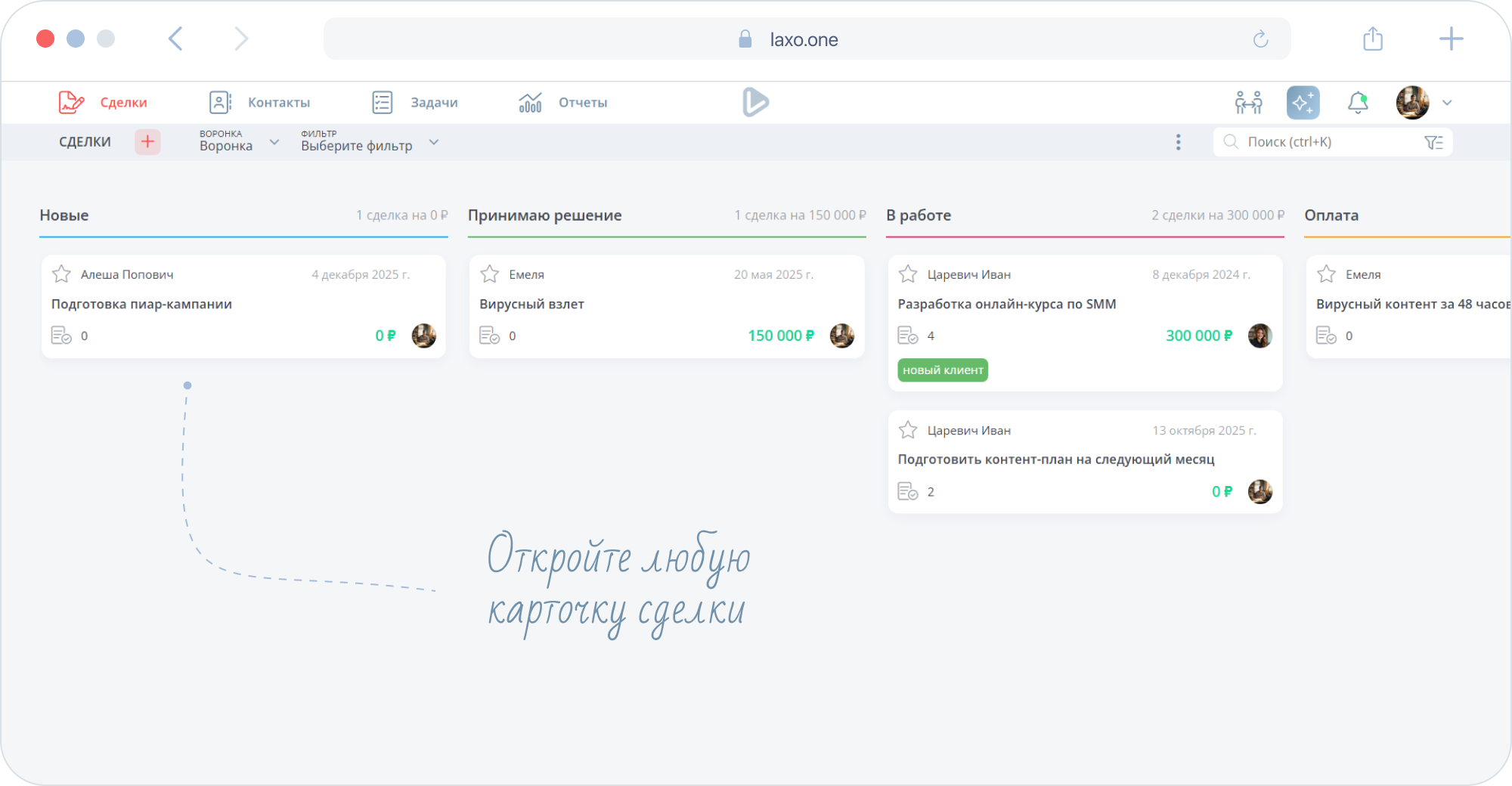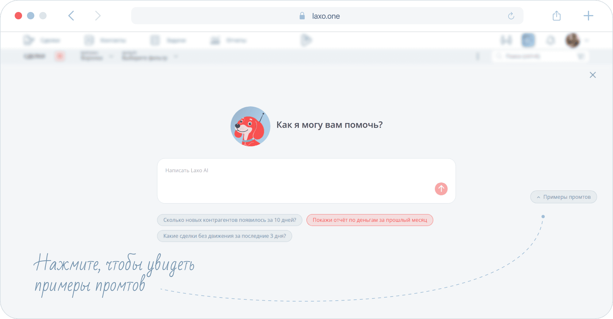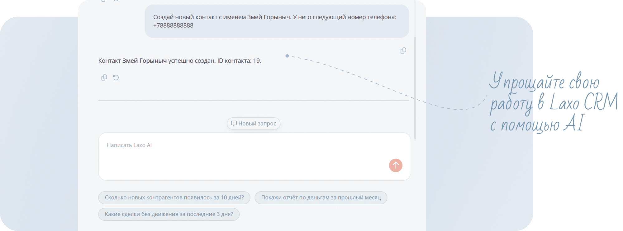AI-помощник laxo упростит вашу работу в CRM. Он может за минуту сгенерировать детальный отчёт, проанализировать любые данные из CRM, создать контакт, сделку или задачу, дать совет по продажам или подсказать, как лучше ответить клиенту.