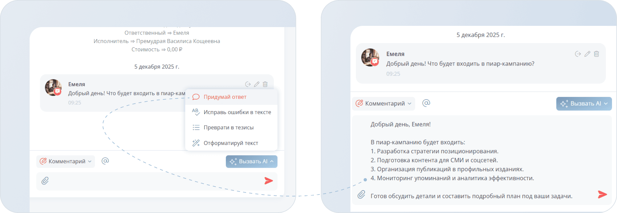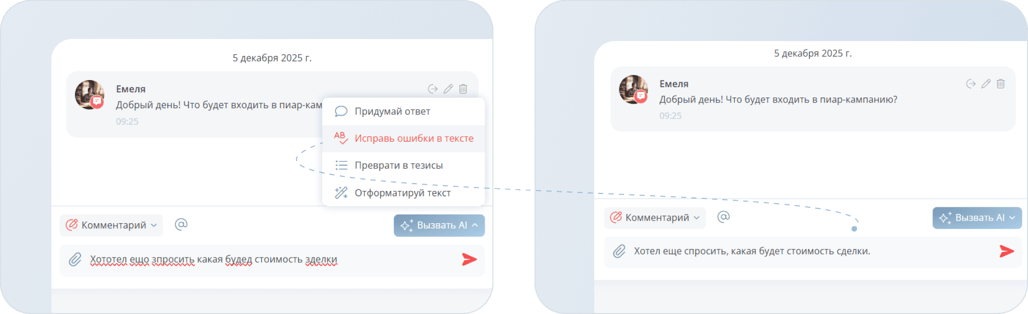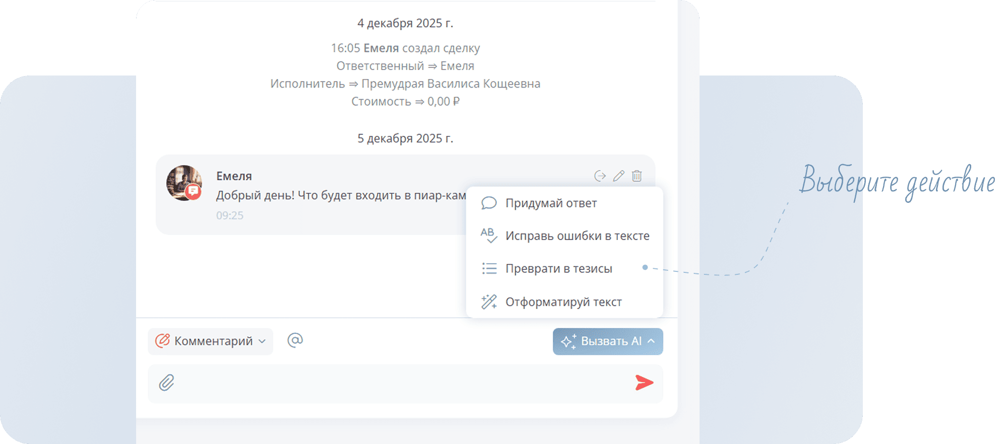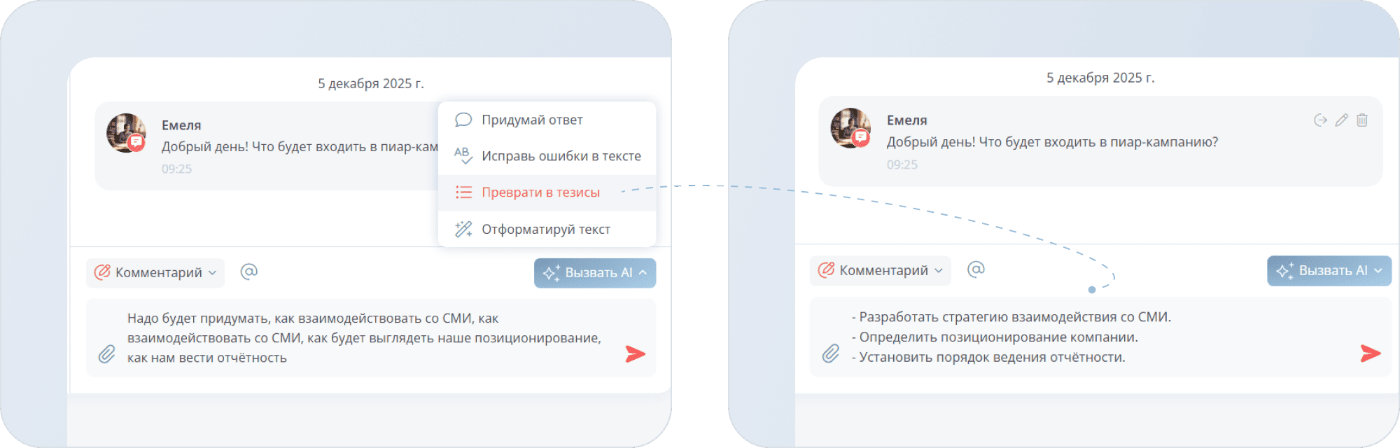 - Нажмите на область вызова AI и выберите нужное действие. С помощью AI-помощника вы можете придумать ответ, исправить ошибки в тексте, отформатировать его или составить тезисы.