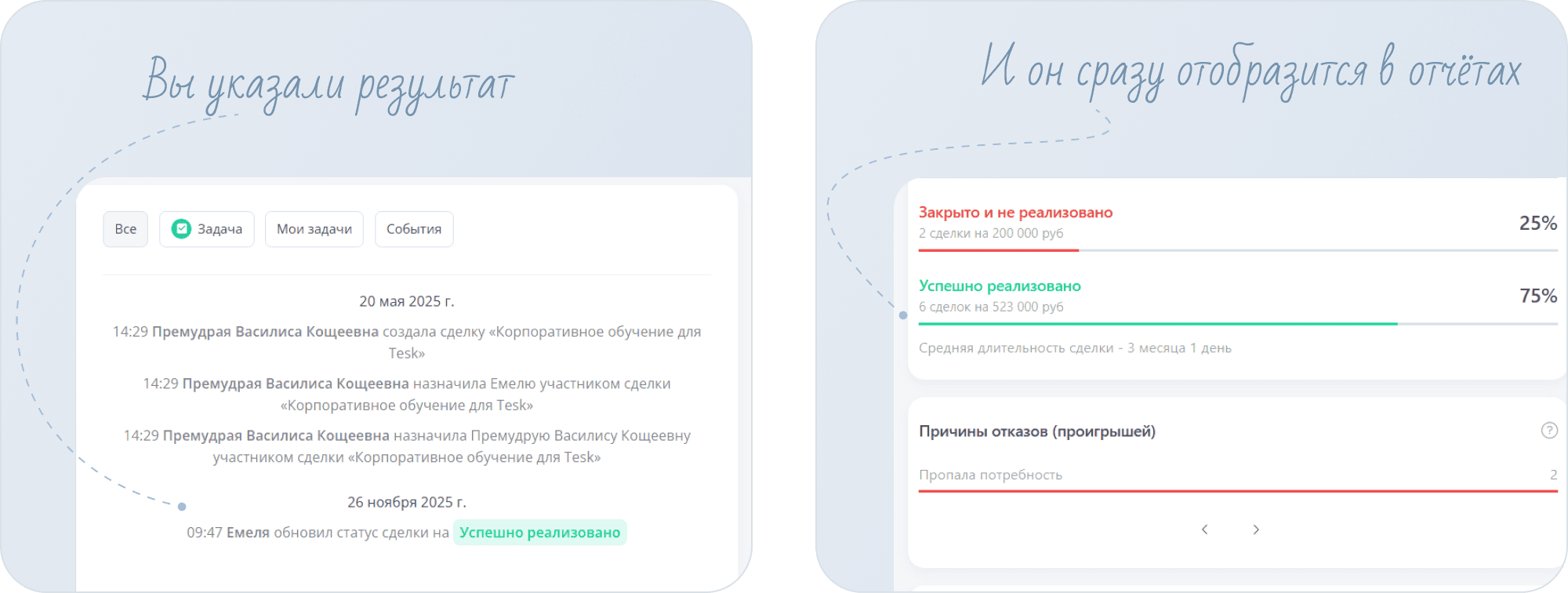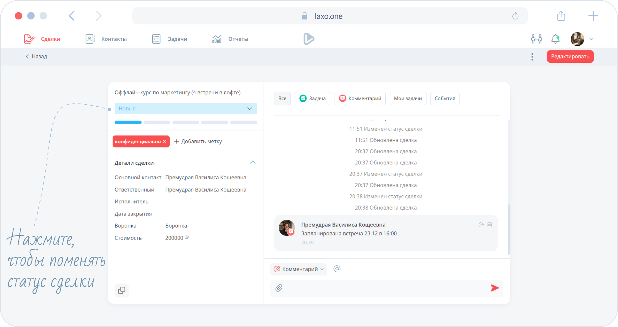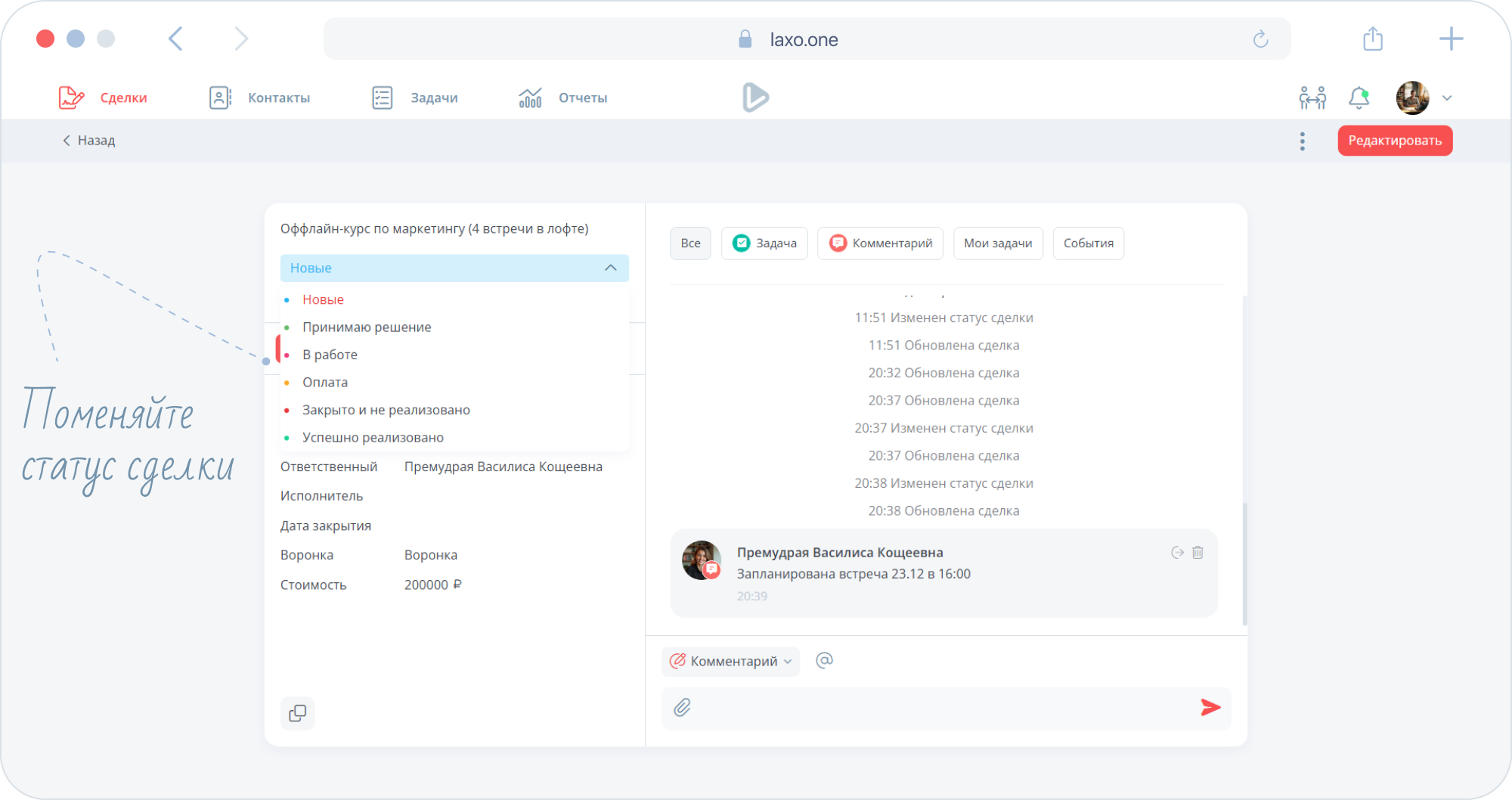 Вы можете изучить детали сделки, отредактировать их, поставить задачи и написать комментарии.