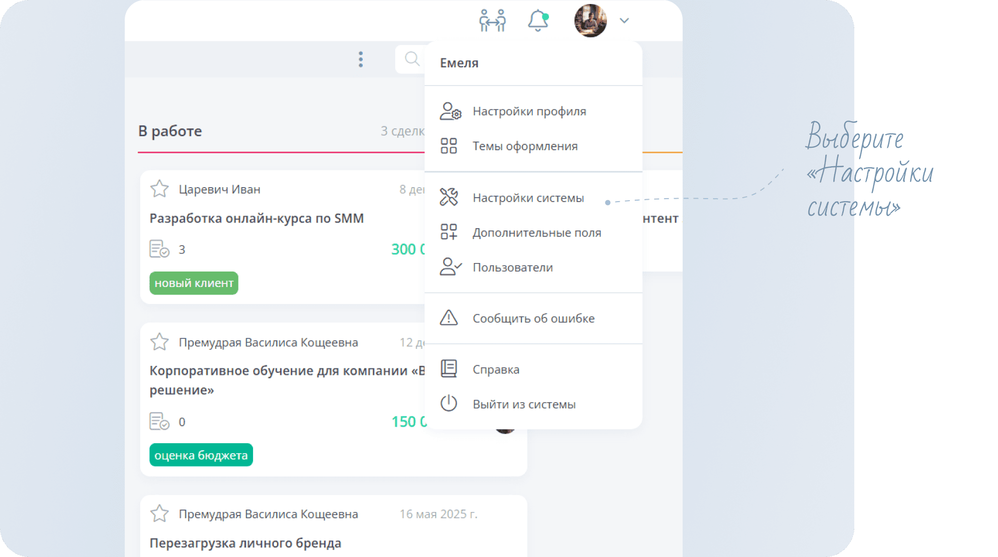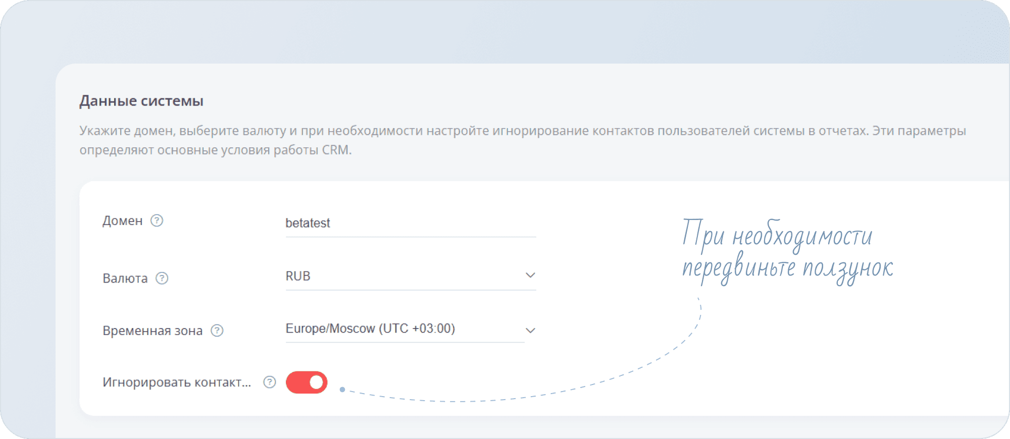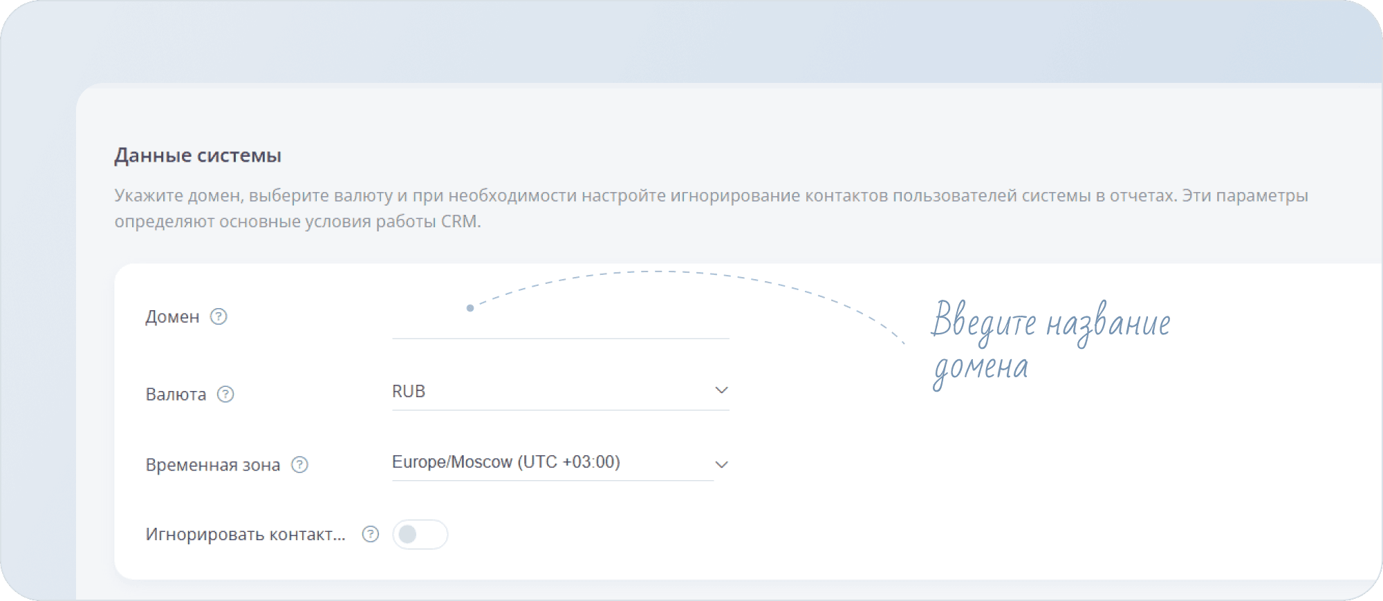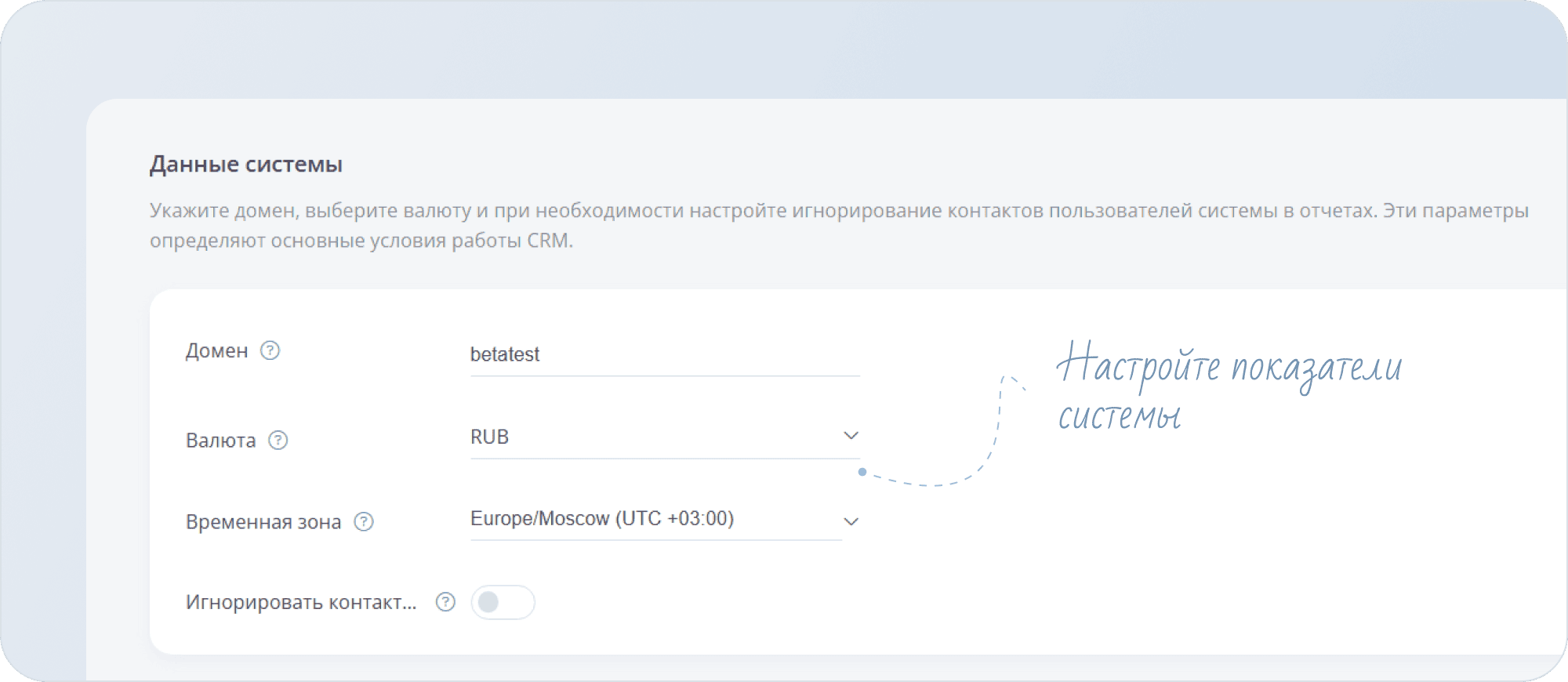 Вы можете выбрать валюту для отображения стоимости сделок и отчётов, а также указать часовой пояс системы, используемый для постановки дедлайнов в задачах.