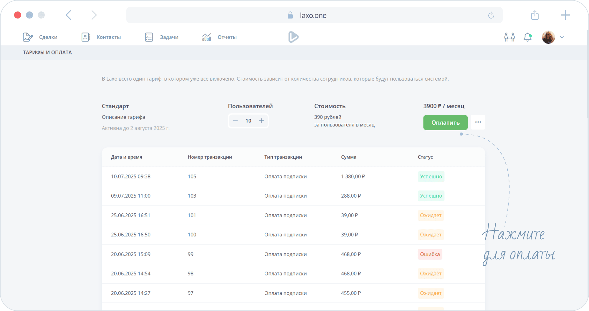 В laxo действует единый тариф, который открывает полный доступ ко всем возможностям системы. Пробный период длится два месяца, после чего cтоимость подписки составляет 390 рублей в месяц за каждого пользователя.