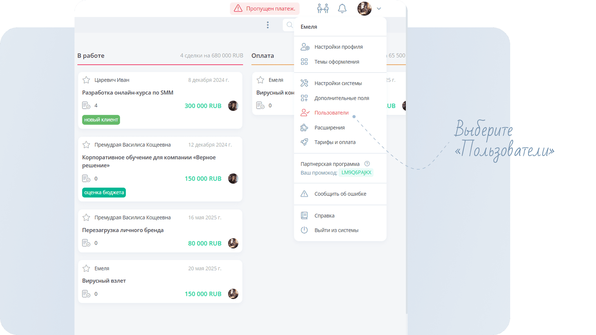 Обратите внимание: в аккаунте, где завершился пробный период, создать ещё одного пользователя можно только после оплаты. Сначала оплатите тариф для дополнительного пользователя, а затем создайте его профиль.