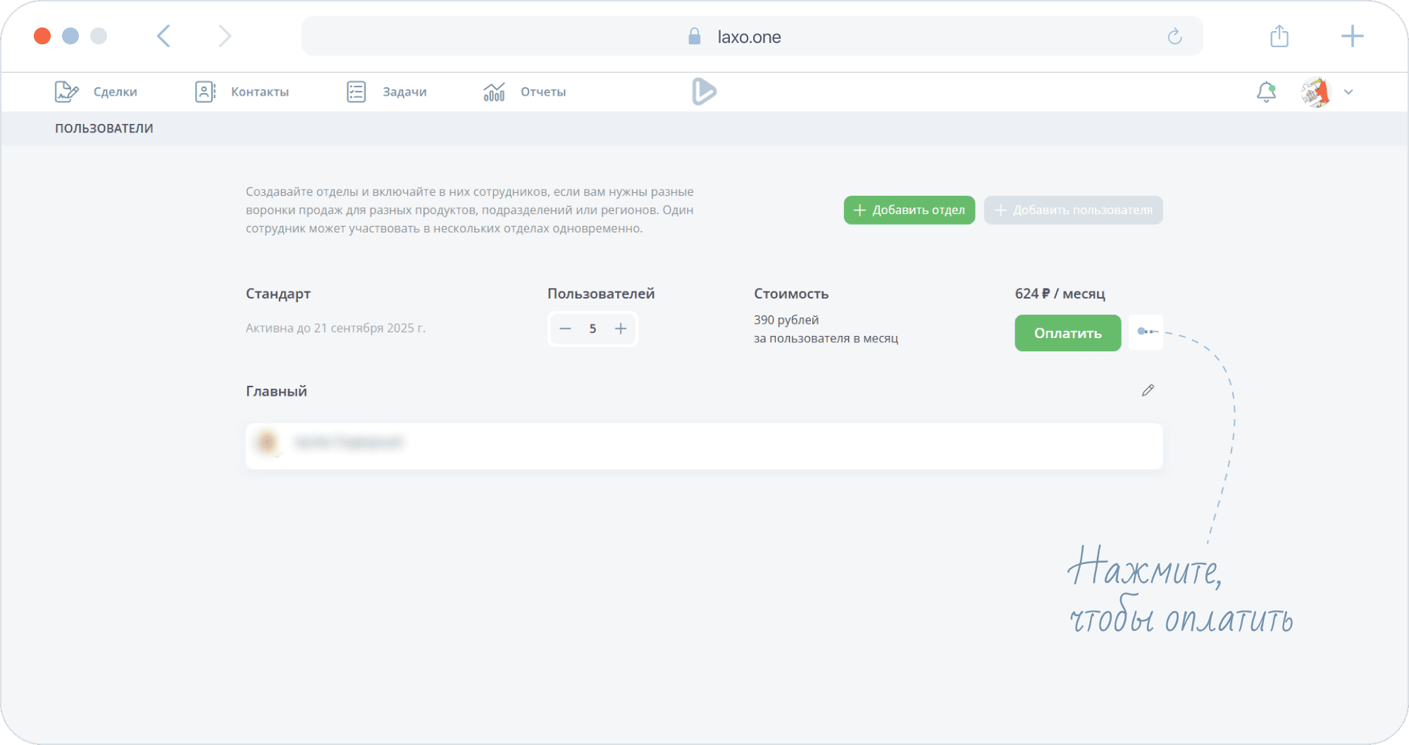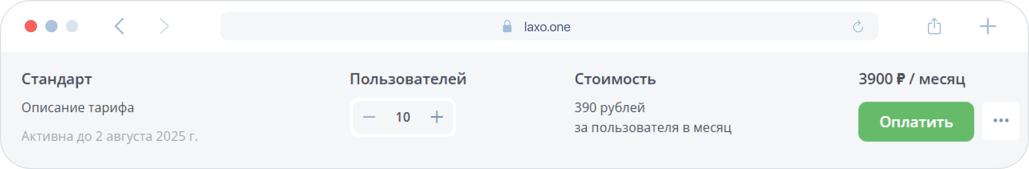 Обратите внимание: все тарифы laxo предоставляют полный функционал без ограничений. Стоимость зависит только от количества пользователей в вашем аккаунте. Новые аккаунты получают два бесплатных месяца, в течение которых можно добавлять сотрудников. После окончания пробного периода добавление новых пользователей возможно только после оплаты.