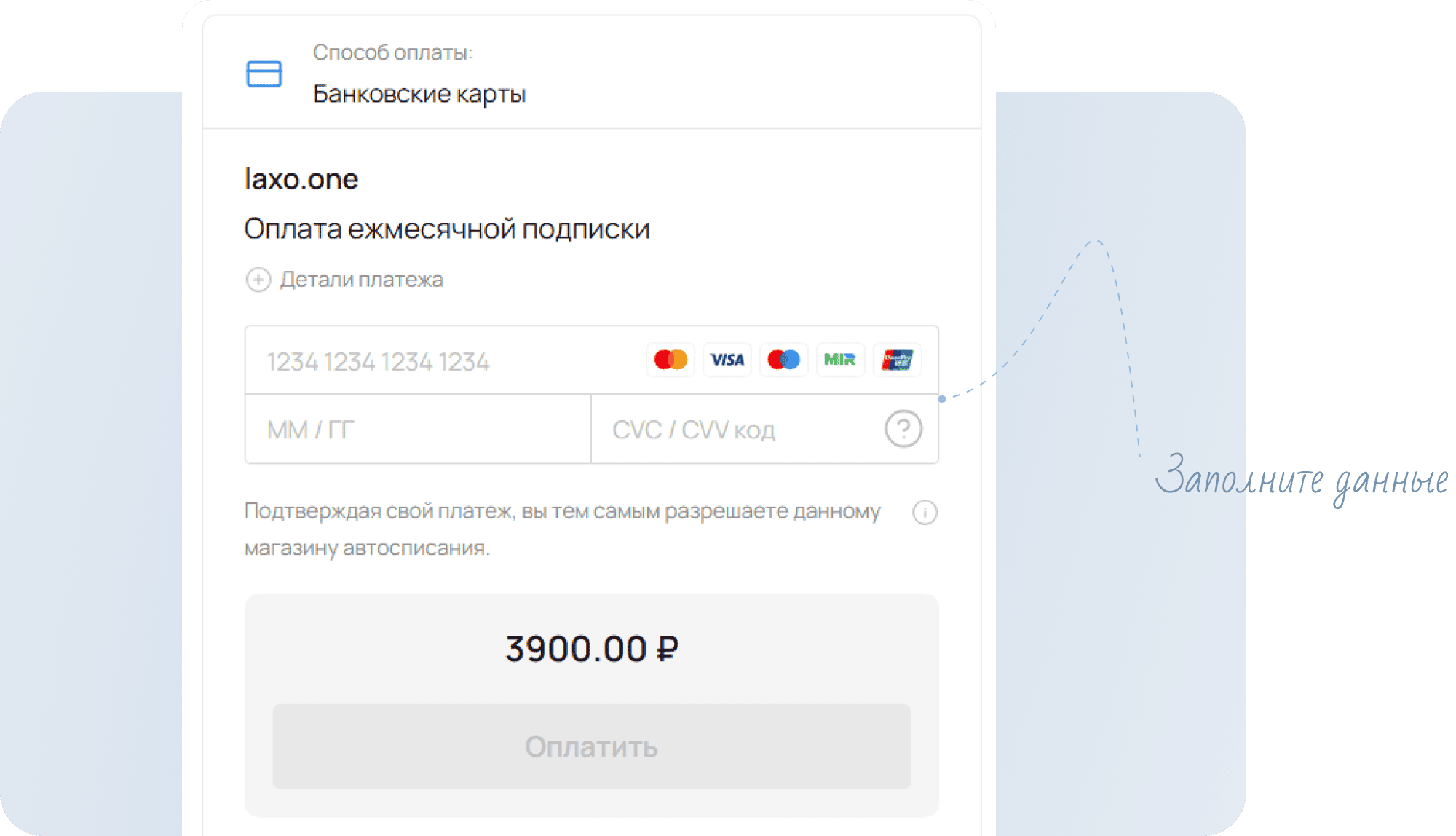 - Заполните реквизиты банковской карты и оплатите подписку.